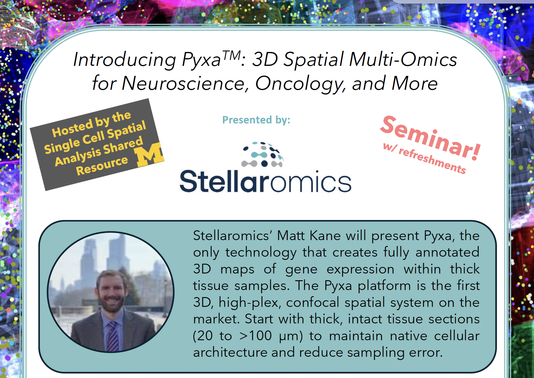 Our program is lead by a team of 6 distinguished faculty representing departments all across campus including Biomedical Engineering, Cell and Developmental Biology, Chemical Engineering, Computational medicine and Bioinformatics, Engineering health sciences, Human Genetics, pathology and Urology in an effort to bring the single cell and spatial analysis research community together.